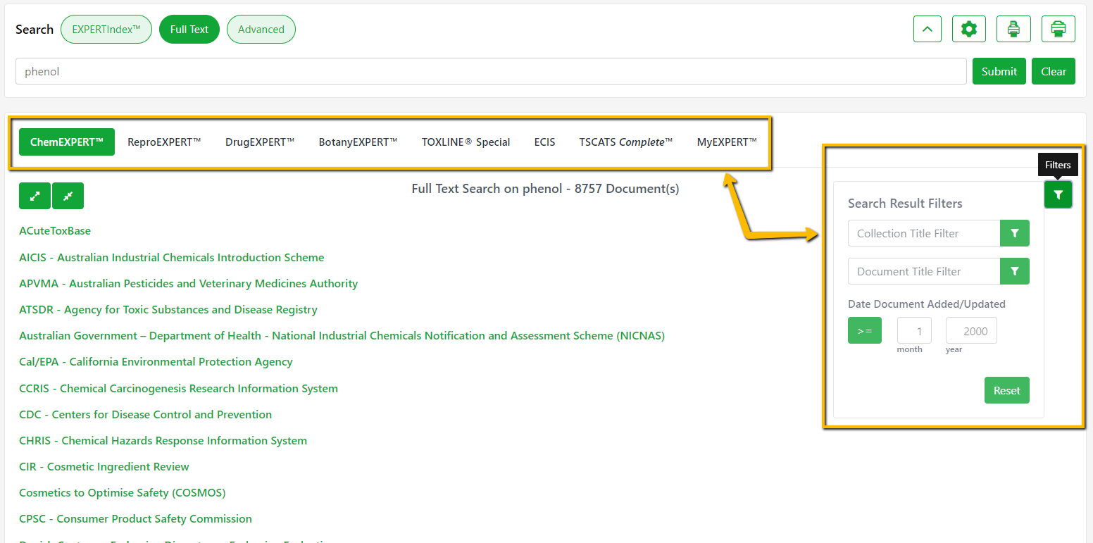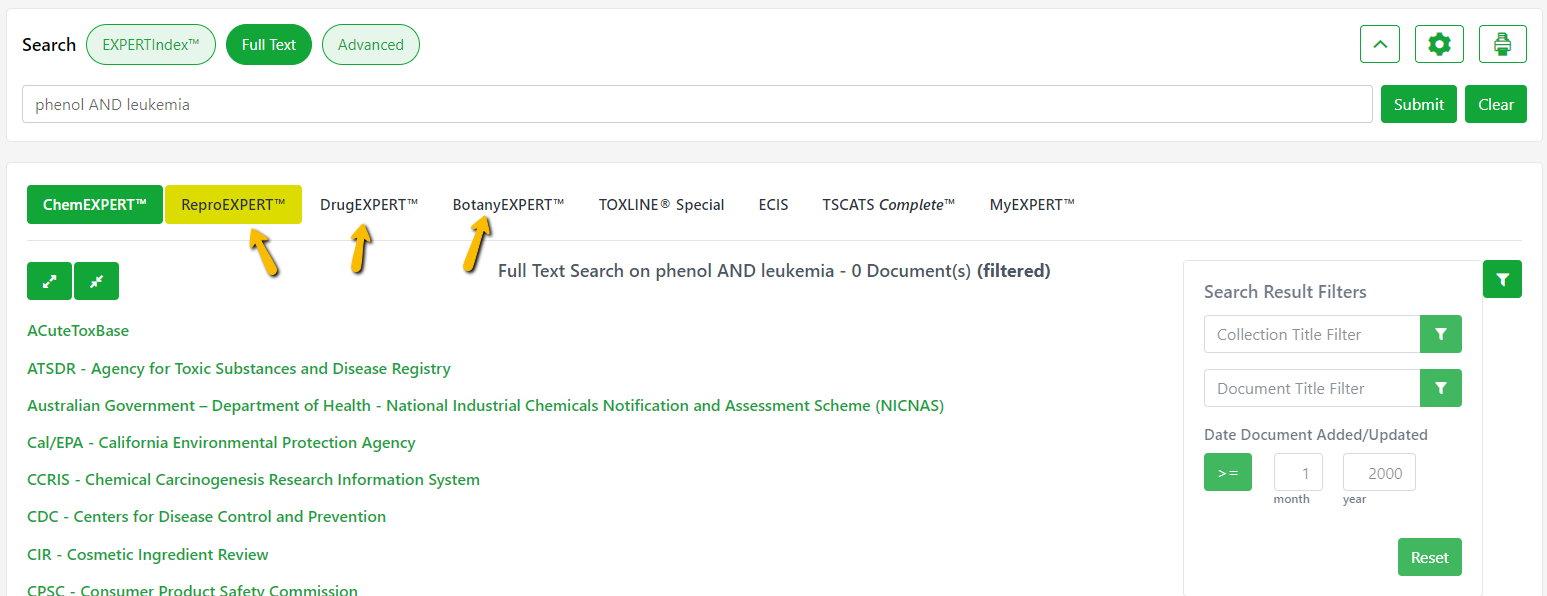 You can refine your search results by selecting specific databases or collections. Additionally, use the Search Result Filters to find specific Collection or Document titles and to filter by Date Added/Updated.