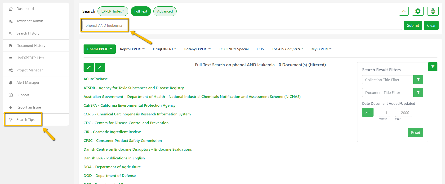 For more precise searches, use Boolean operators (AND, OR, NOT). For example, entering phenol AND leukemia will narrow down your results. For detailed search tips, click on Search Tips in the navigation menu.