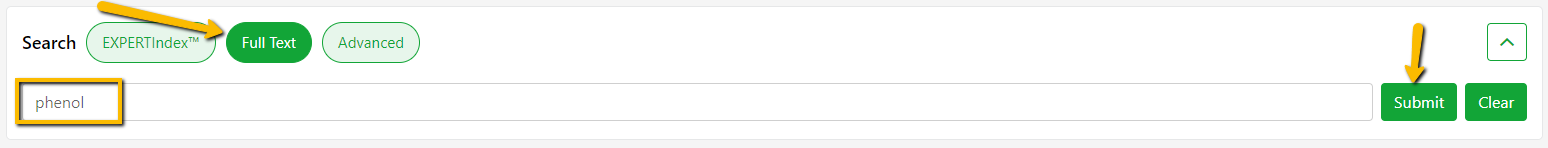 The Full Text search tool is located near the top of your screen. Enter the desired word or phrase in the search box, then click the Submit button to execute the search.