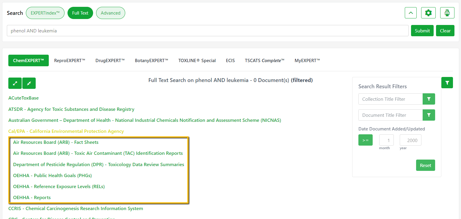After performing a search, you will see a list of documents that match your search criteria. In this example, the list includes documents containing both "phenol" and "leukemia." The display provides additional information, such as the total number of documents found. You can navigate through the results by clicking on a Product Tab (e.g., ChemEXPERT, ReproEXPERT).