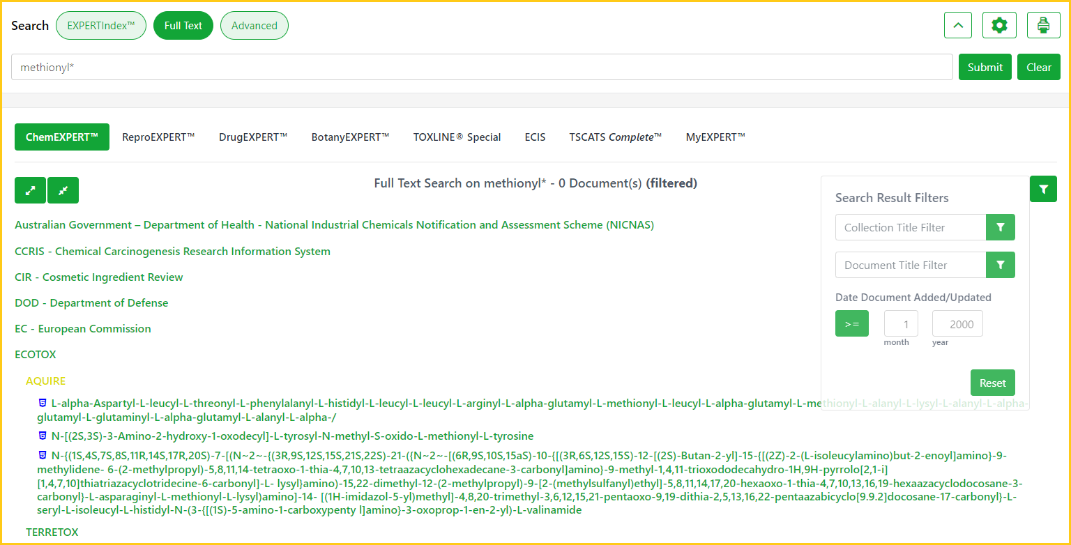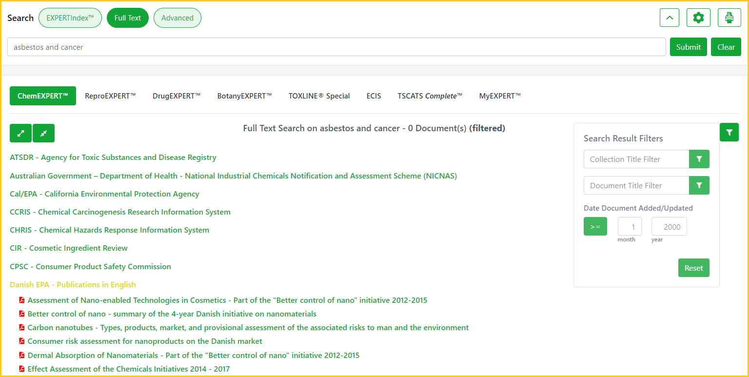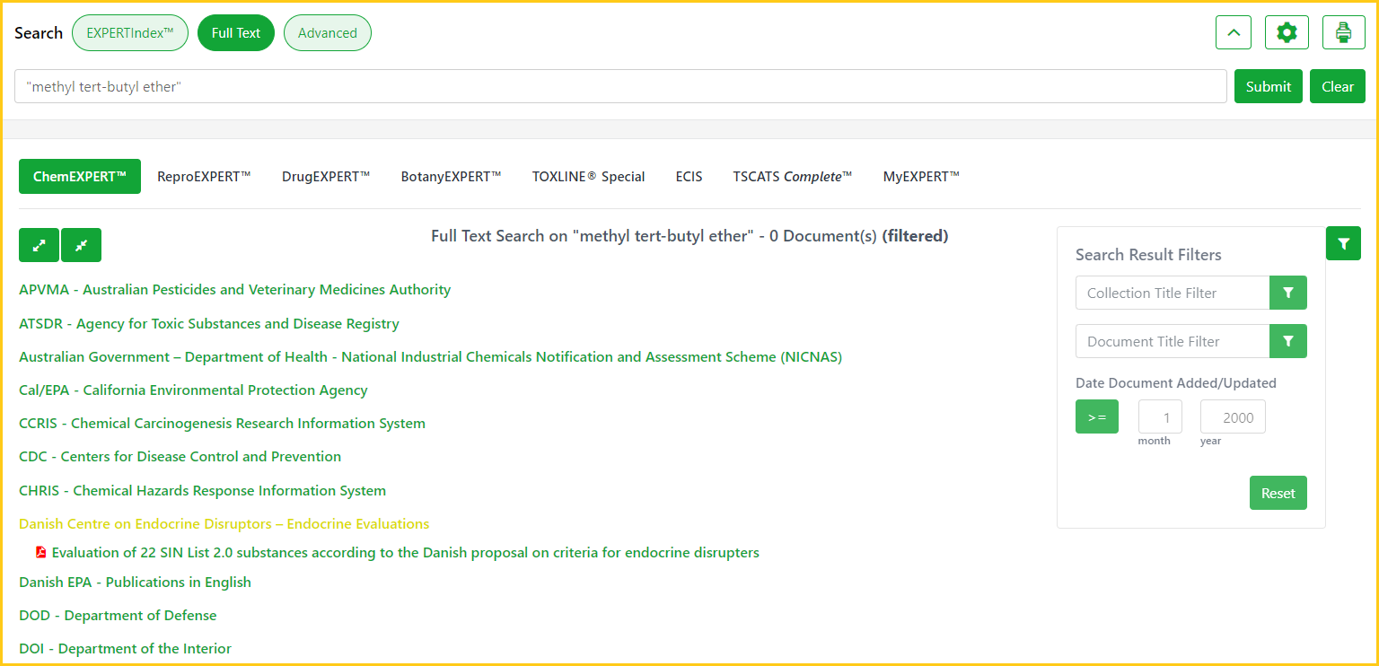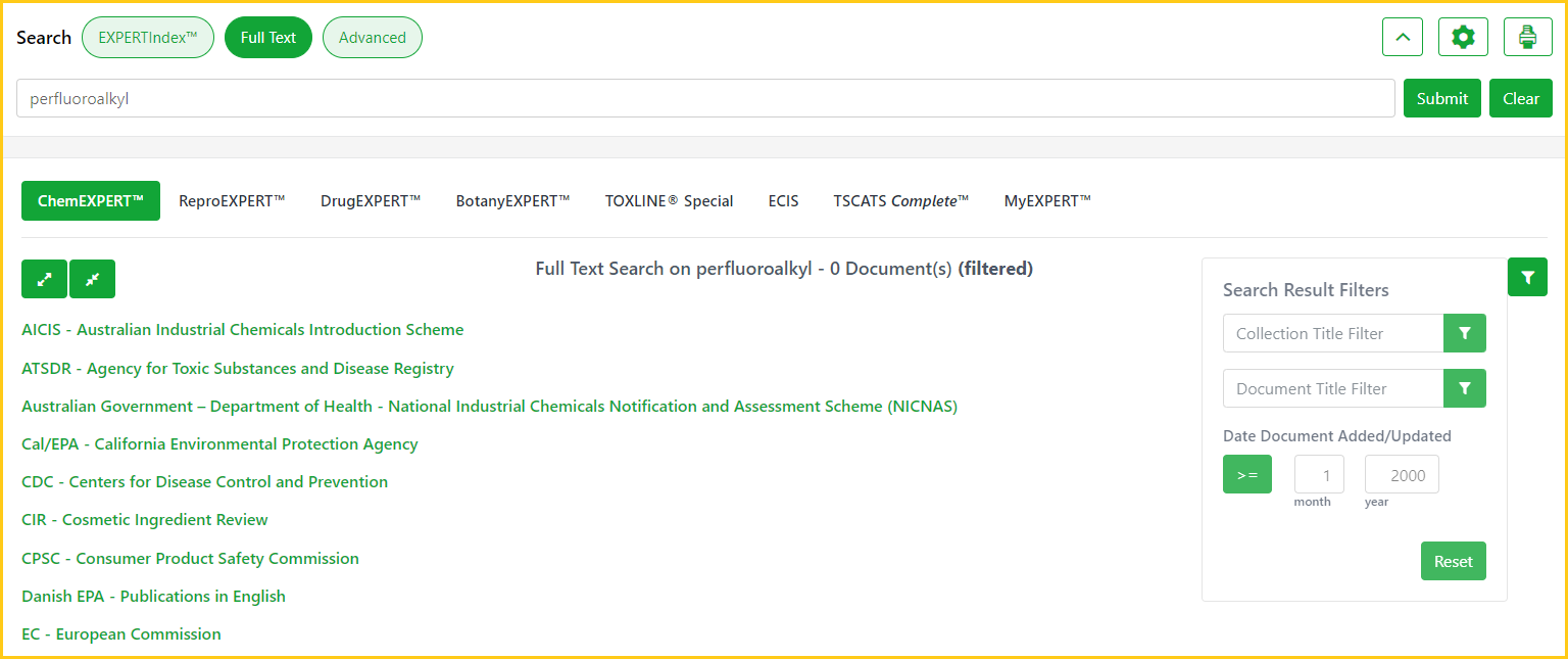 To search for a specific term, enter the term into the search box. For example, to find documents containing the term "perfluoroalkyl," type perfluoroalkyl and click Submit. The search results will show documents, organized by product and content collections, that include the term "perfluoroalkyl" in the full text.