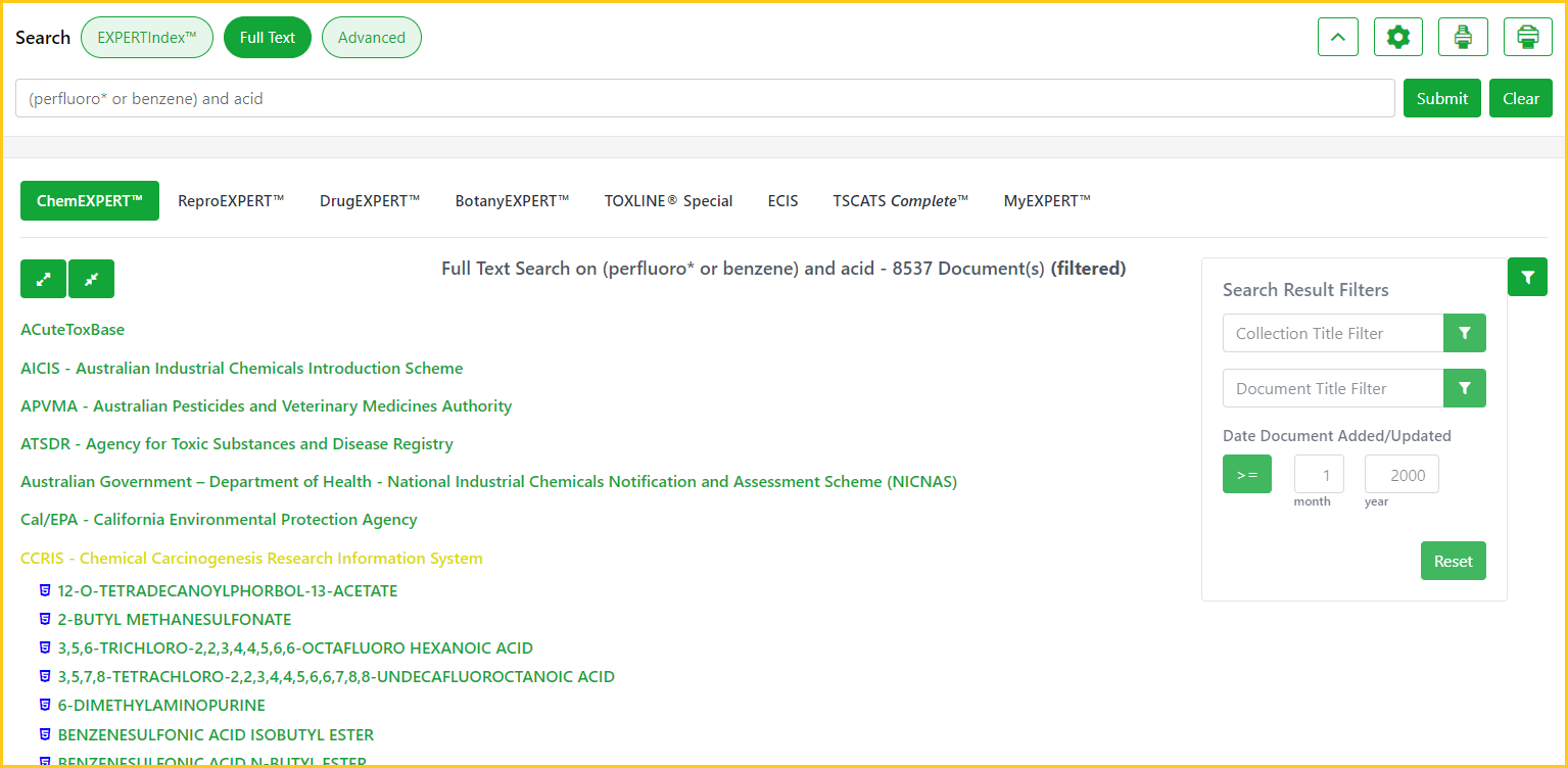 You can combine different search types in a single query. For example, to search for documents containing terms starting with "perfluoro" or the term "benzene" and also the term "acid", enter (perfluoro* OR benzene) AND acid and click Submit. The results will display documents where the full text includes terms starting with "perfluoro" or "benzene" and also "acid."