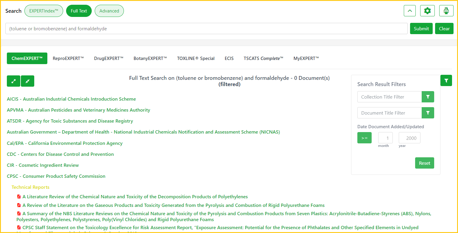 You can group multiple search terms or clauses using parentheses. For example, to search for documents containing either "toluene" or "bromobenzene" and also "formaldehyde", enter (toluene OR bromobenzene) AND formaldehyde and click Submit. The search results will show documents where the full text contains either "toluene" or "bromobenzene" and also "formaldehyde."