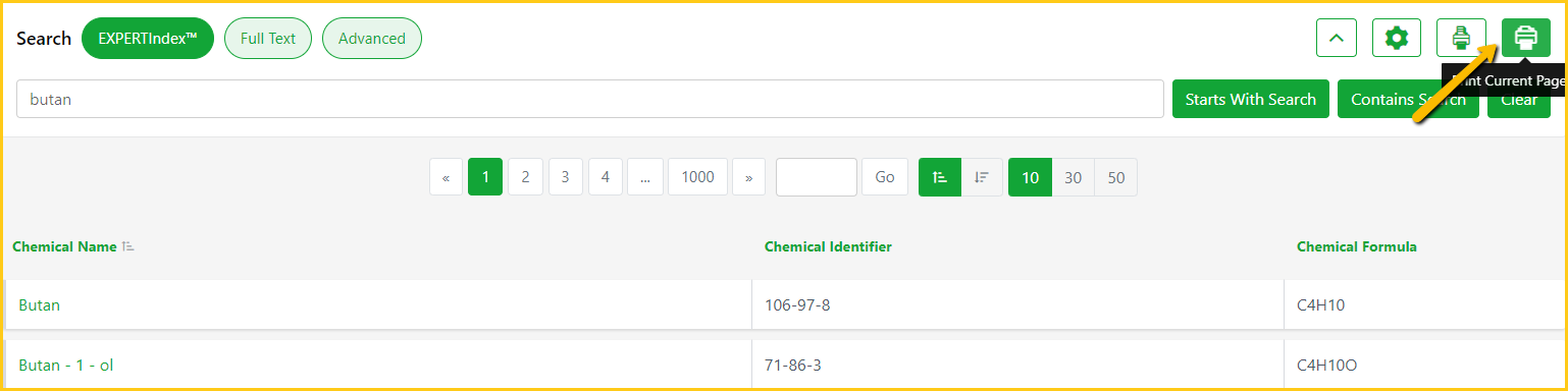 To print results from the current page, click the Print Current Page icon in the top right corner.