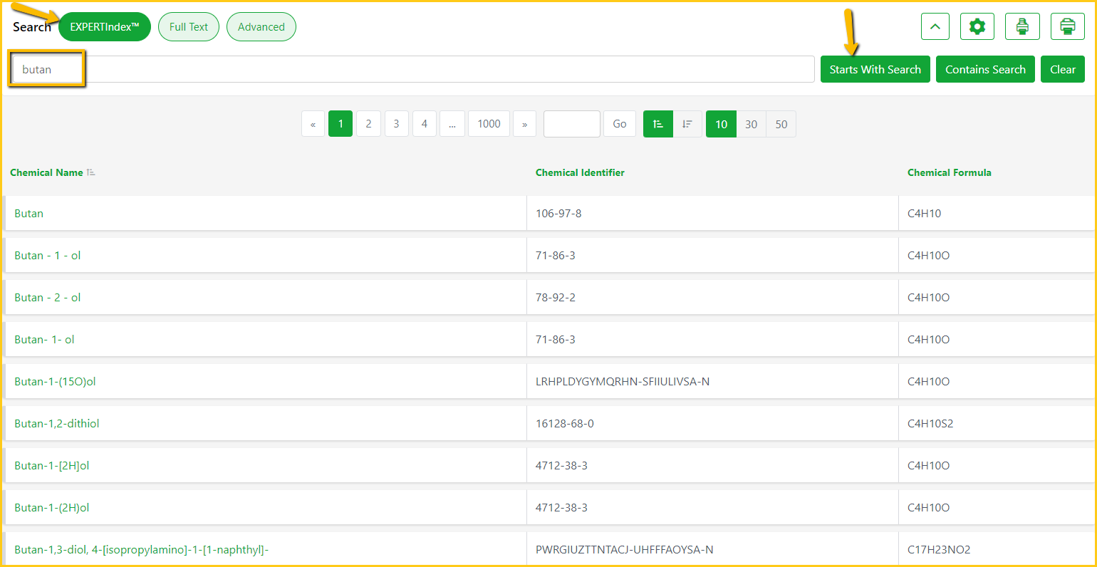 To begin an EXPERTIndex search, navigate to the Dashboard and enter a search term in the EXPERTIndex Search box. You can choose from several search options, such as Starts With or Contains. For example, enter "butan" and select "Starts With."