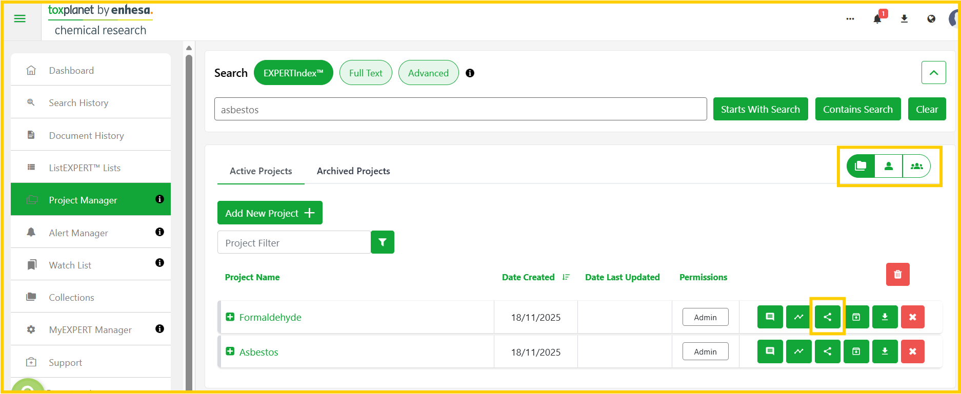 In your Project Manager menu, you'll see three buttons at the top right of the page. These settings allow you to filter your Project by all projects, your personal projects, and account-level projects.