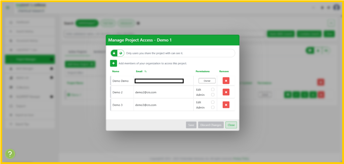 - Admin: enables the user to manage the project (change project name and description, as well as add or remove other users and change permissions