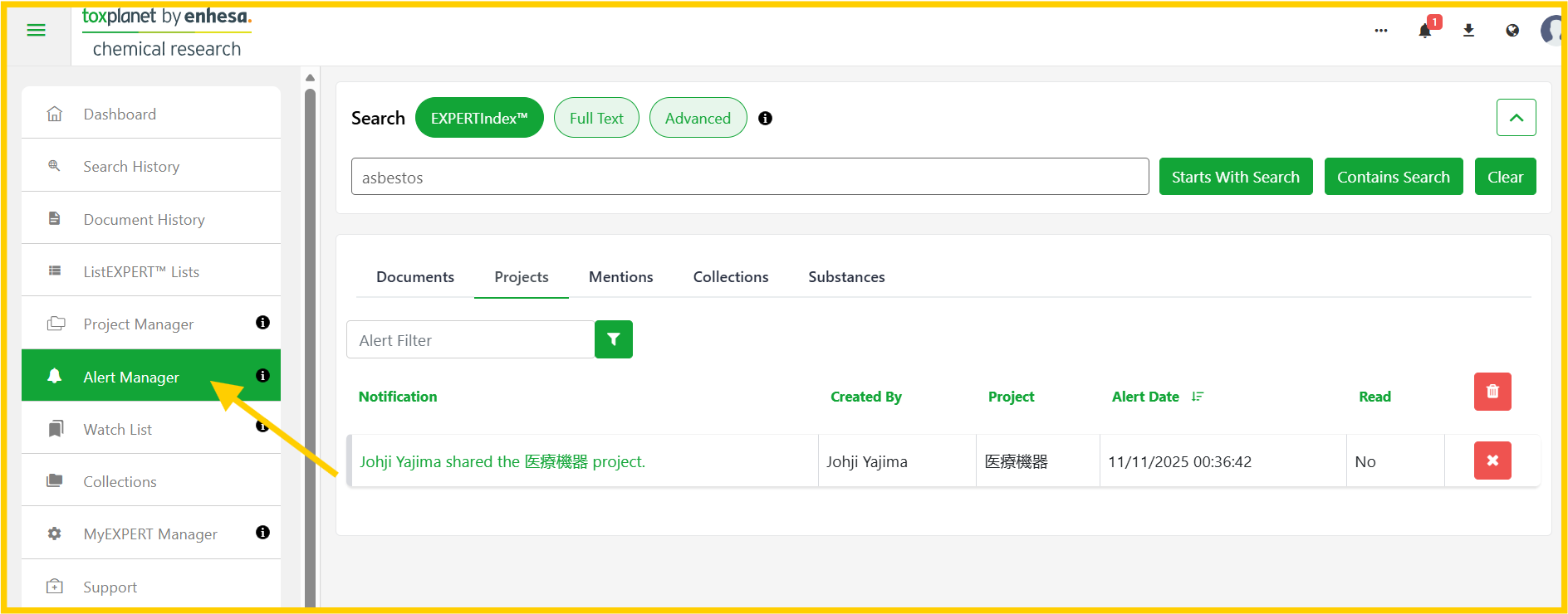 Project Notifications: You'll be notified when you are given access to a new project. To view updates to projects, click on the Alert Manager menu. You'll also be able to view alerts related to projects in the notification (bell) icon in the top right of your application window.