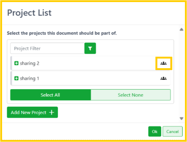 Projects that have been shared with you or are part of an account will be identified with a "shared" icon. When adding documents to a project, you can also see which projects are shared based on the same icon.