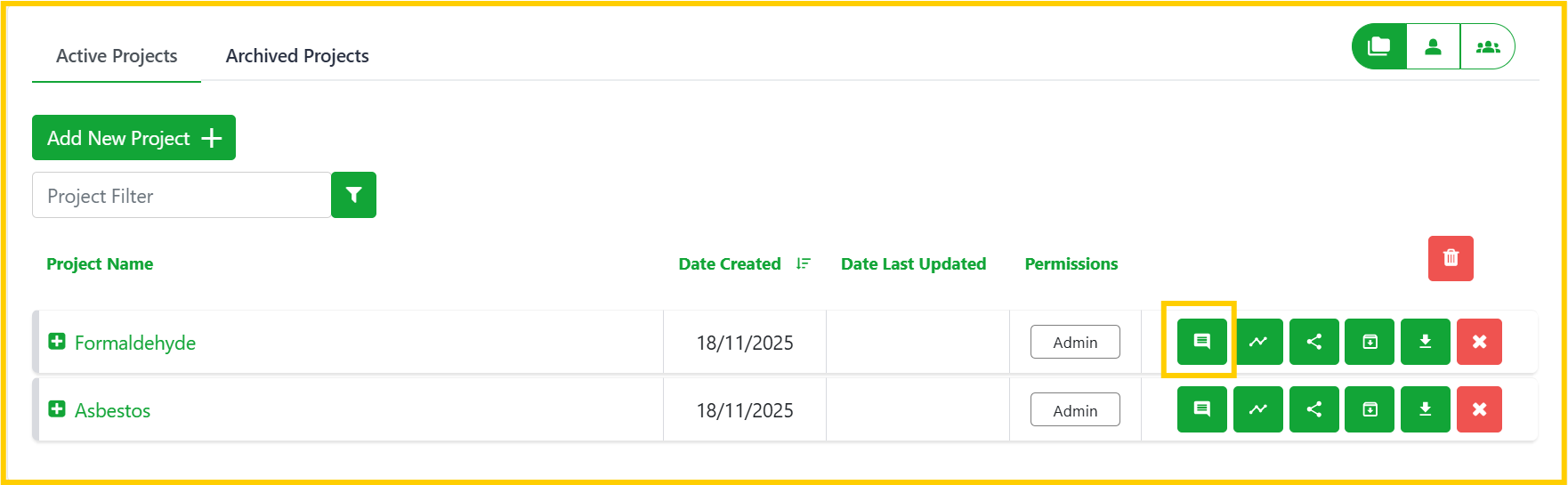 Add notes to your personal projects or shared projects across your account. Your notes can be set as private or public (visible to other account team members). If the notes icon is greyed out, it means you don't have permission to edit the project or add notes to it.