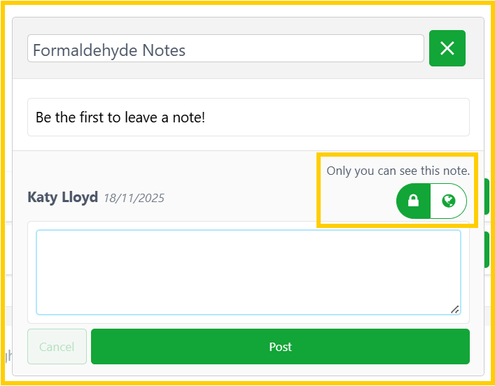 Public notes are visible to everyone with access to the project and everyone with access to the document, the latter being everyone in the account.