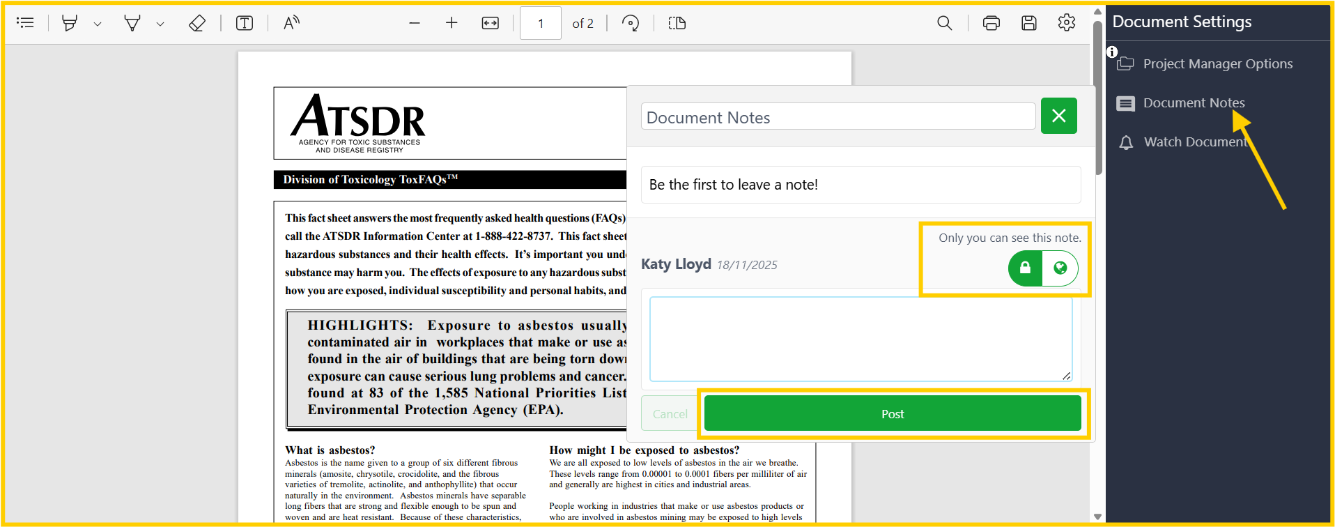 You will also be able to add notes to documents, and these can be private or public. In both cases, private notes are the default option. Threaded discussions are also available in this scenario too.
